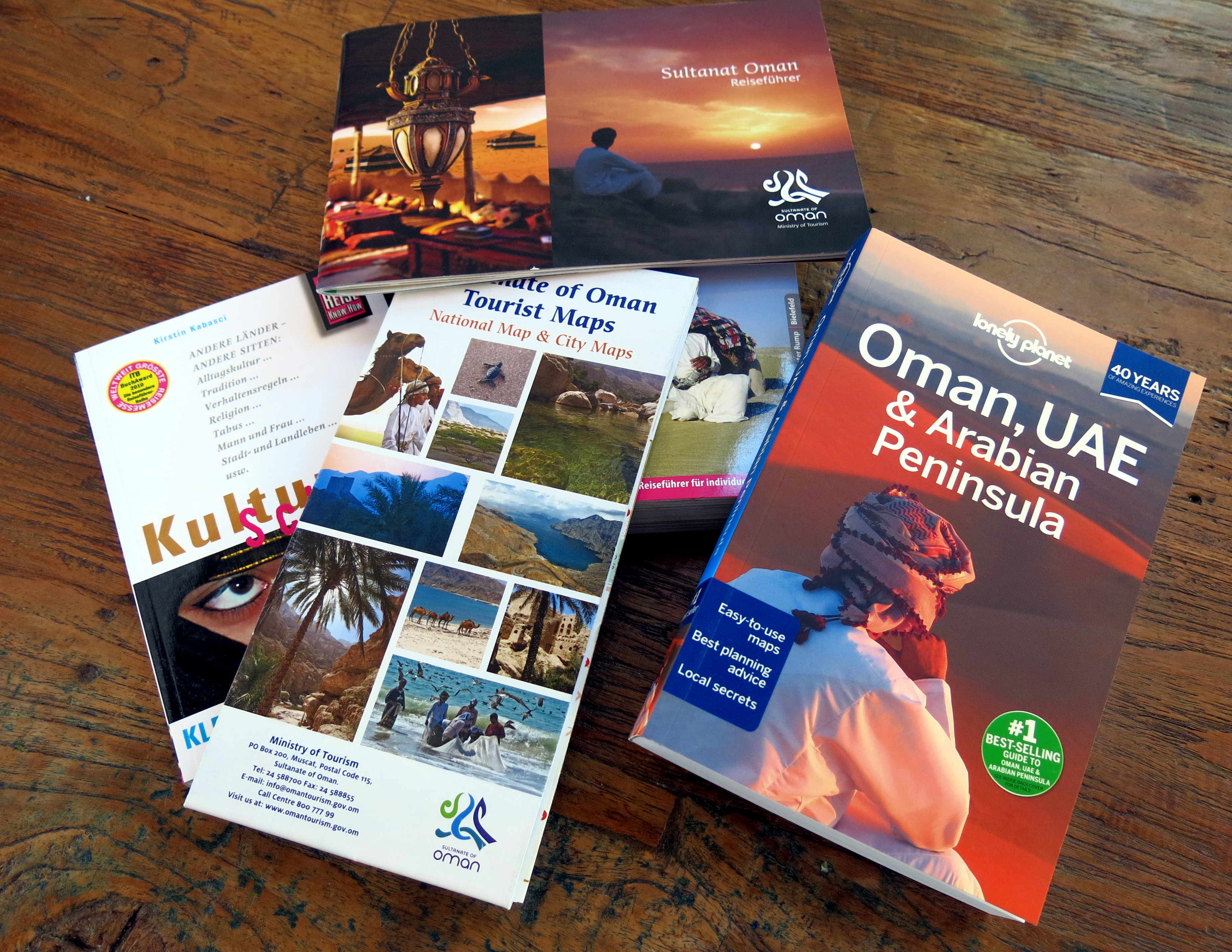 Doch dann passiert es: Es klingelt an der Tür. Ich öffne und blicke in fröhliche blaue Augen und das breite Grinsen eines gut gelaunten Paketzustellers. Im „Sack“ hat er drei Pakete nur für mich. Eine funkelnagelneue Sonnenbrille, die ich garantiert für meine nächste Reise brauchen werde, eine Auswahl an Reiseführern und ein unerwartetes Überraschungspaket mit Karten und Informationsmaterial des Tourismusministeriums des Oman. Plötzlich bin ich wieder ganz bei der Sache und ganz weit weg. In knapp drei Wochen soll es losgehen. Ich schaue mir die Bilder an, flippe durch die Seiten, bleiben an Passagen hängen, studiere die Karte, mach Notizen, vergesse, dass ich meine neue Sonnenbrille noch auf dem Kopf habe und obendrein die Zeit. Lasse das Telefon klingeln, ignoriere den Berg auf dem Schreibtisch, die schwere Last auf meinen Schultern und den Knoten in der Magengegend. Ich stecke mittendrin in der Reisplanung. Bunte Bilder machen sich breit und verdrängen die Grautöne. War da was? Mir wird klar, Reisen zu dürfen macht mich glücklich! (und Sonnenbrillen auch 😉